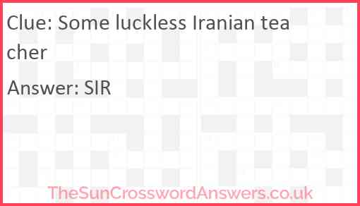 Some luckless Iranian teacher is a crossword clue for which we have 1 possible answer and we have spotted 3 times in our database. This crossword clue was last seen on 21 June 2025 in The Sun Cryptic Crossword puzzle!