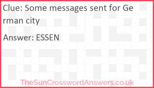 Some messages sent for German city is a crossword clue for which we have 1 possible answer and we have spotted 2 times in our database. This crossword clue was last seen on 10 February 2025 in The Sun Cryptic Crossword puzzle!