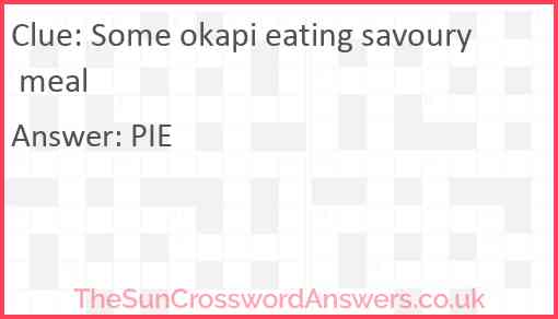 Some okapi eating savoury meal is a crossword clue for which we have 1 possible answer and we have spotted 2 times in our database. This crossword clue was last seen on 21 March 2025 in The Sun Cryptic Crossword puzzle!