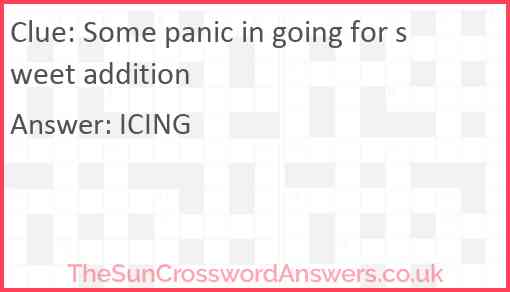 Some panic in going for sweet addition is a crossword clue for which we have 1 possible answer and we have spotted 3 times in our database. This crossword clue was last seen on 22 August 2023 in The Sun Cryptic Crossword puzzle!