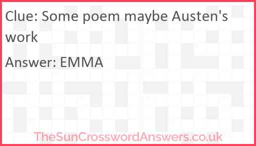 Some poem maybe Austen's work is a crossword clue for which we have 1 possible answer and we have spotted 1 times in our database. This crossword clue was last seen on 23 February 2025 in The Sun Cryptic Crossword puzzle!