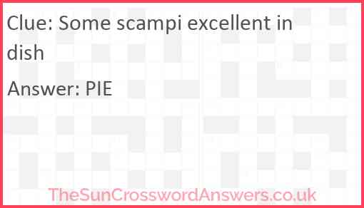 Some scampi excellent in dish is a crossword clue for which we have 1 possible answer and we have spotted 1 times in our database. This crossword clue was last seen on 12 February 2025 in The Sun Cryptic Crossword puzzle!