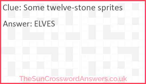 Some twelve-stone sprites is a crossword clue for which we have 1 possible answer and we have spotted 2 times in our database. This crossword clue was last seen on 26 December 2024 in The Sun Cryptic Crossword puzzle!