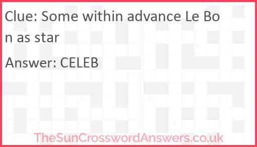 Some within advance Le Bon as star is a crossword clue for which we have 1 possible answer and we have spotted 2 times in our database. This crossword clue was last seen on 19 November 2023 in The Sun Cryptic Crossword puzzle!