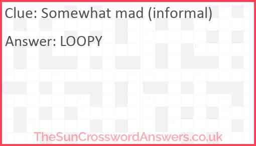 Somewhat mad (informal) is a crossword clue for which we have 1 possible answer and we have spotted 1 times in our database. This crossword clue was last seen on 26 April 2019 in The Sun Coffee Time Crossword puzzle!