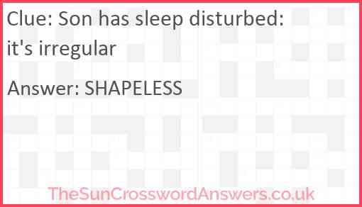 Son has sleep disturbed: it's irregular is a crossword clue for which we have 1 possible answer and we have spotted 1 times in our database. This crossword clue was last seen on 05 February 2025 in The Sun Cryptic Crossword puzzle!