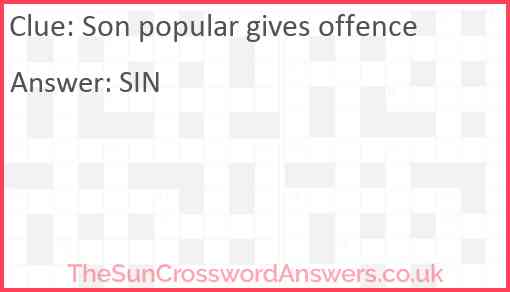 Son popular gives offence is a crossword clue for which we have 1 possible answer and we have spotted 2 times in our database. This crossword clue was last seen on 05 May 2024 in The Sun Cryptic Crossword puzzle!