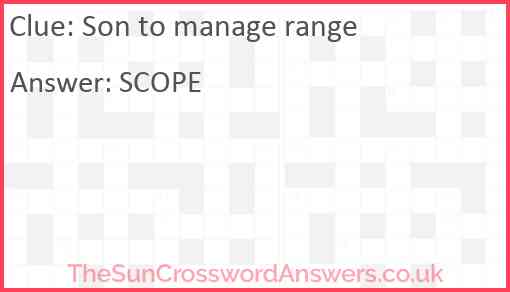 Son to manage range is a crossword clue for which we have 1 possible answer and we have spotted 1 times in our database. This crossword clue was last seen on 03 November 2024 in The Sun Cryptic Crossword puzzle!