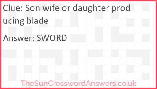 Son wife or daughter producing blade is a crossword clue for which we have 1 possible answer and we have spotted 3 times in our database. This crossword clue was last seen on 29 August 2024 in The Sun Cryptic Crossword puzzle!