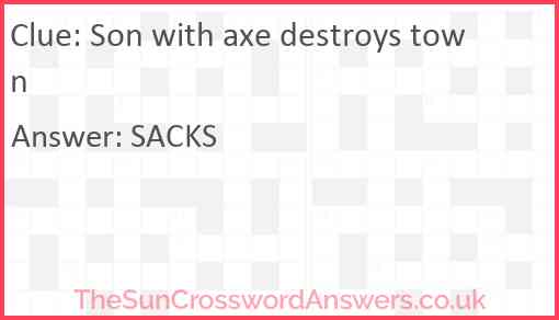Son with axe destroys town is a crossword clue for which we have 1 possible answer and we have spotted 1 times in our database. This crossword clue was last seen on 25 November 2024 in The Sun Cryptic Crossword puzzle!