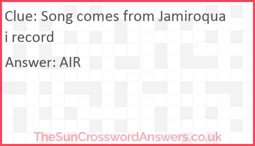 Song comes from Jamiroquai record is a crossword clue for which we have 1 possible answer and we have spotted 4 times in our database. This crossword clue was last seen on 06 October 2024 in The Sun Cryptic Crossword puzzle!