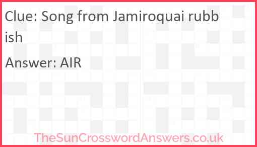 Song from Jamiroquai rubbish is a crossword clue for which we have 1 possible answer and we have spotted 2 times in our database. This crossword clue was last seen on 23 March 2025 in The Sun Cryptic Crossword puzzle!