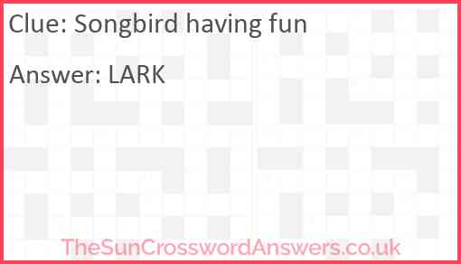 Songbird having fun is a crossword clue for which we have 1 possible answer and we have spotted 1 times in our database. This crossword clue was last seen on 12 August 2024 in The Sun Cryptic Crossword puzzle!