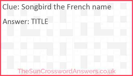 Songbird the French name is a crossword clue for which we have 1 possible answer and we have spotted 3 times in our database. This crossword clue was last seen on 13 May 2024 in The Sun Cryptic Crossword puzzle!