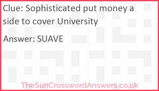 Sophisticated put money aside to cover University is a crossword clue for which we have 1 possible answer and we have spotted 1 times in our database. This crossword clue was last seen on 20 September 2024 in The Sun Cryptic Crossword puzzle!