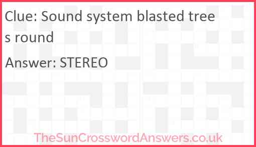 Sound system blasted trees round is a crossword clue for which we have 1 possible answer and we have spotted 2 times in our database. This crossword clue was last seen on 25 September 2024 in The Sun Cryptic Crossword puzzle!