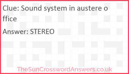 Sound system in austere office is a crossword clue for which we have 1 possible answer and we have spotted 3 times in our database. This crossword clue was last seen on 06 November 2024 in The Sun Cryptic Crossword puzzle!