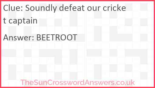Soundly defeat our cricket captain is a crossword clue for which we have 1 possible answer and we have spotted 1 times in our database. This crossword clue was last seen on 01 May 2022 in The Sun Cryptic Crossword puzzle!