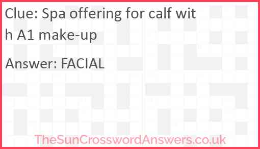 Spa offering for calf with A1 make-up is a crossword clue for which we have 1 possible answer and we have spotted 1 times in our database. This crossword clue was last seen on 11 June 2023 in The Sun Cryptic Crossword puzzle!