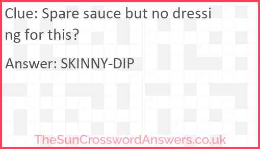 Spare sauce but no dressing for this? is a crossword clue for which we have 2 possible answer and we have spotted 2 times in our database. This crossword clue was last seen on 10 June 2023 in The Sun Cryptic Crossword puzzle!