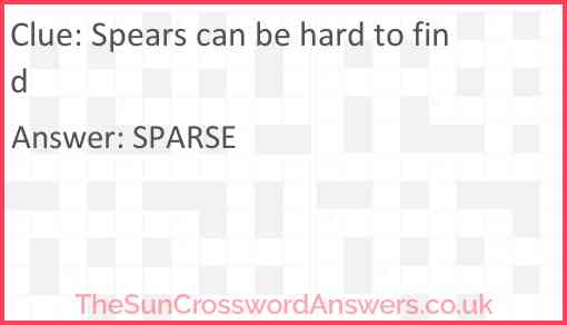 Spears can be hard to find is a crossword clue for which we have 1 possible answer and we have spotted 4 times in our database. This crossword clue was last seen on 11 September 2024 in The Sun Cryptic Crossword puzzle!
