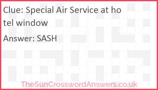 Special Air Service at hotel window is a crossword clue for which we have 1 possible answer and we have spotted 2 times in our database. This crossword clue was last seen on 26 May 2024 in The Sun Cryptic Crossword puzzle!