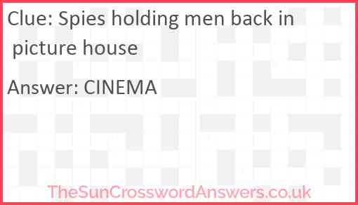 Spies holding men back in picture-house is a crossword clue for which we have 1 possible answer and we have spotted 2 times in our database. This crossword clue was last seen on 27 June 2023 in The Sun Cryptic Crossword puzzle!