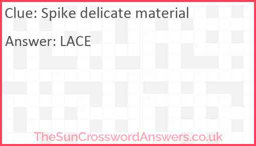 Spike delicate material is a crossword clue for which we have 1 possible answer and we have spotted 1 times in our database. This crossword clue was last seen on 01 May 2022 in The Sun Cryptic Crossword puzzle!