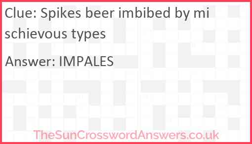 Spikes beer imbibed by mischievous types is a crossword clue for which we have 1 possible answer and we have spotted 1 times in our database. This crossword clue was last seen on 27 February 2023 in The Sun Cryptic Crossword puzzle!