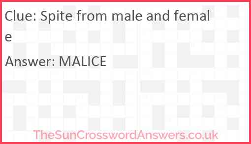 Spite from male and female is a crossword clue for which we have 1 possible answer and we have spotted 1 times in our database. This crossword clue was last seen on 11 March 2023 in The Sun Cryptic Crossword puzzle!