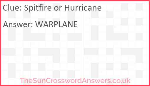 Spitfire or Hurricane is a crossword clue for which we have 1 possible answer and we have spotted 1 times in our database. This crossword clue was last seen on 19 August 2020 in The Sun Coffee Time Crossword puzzle!