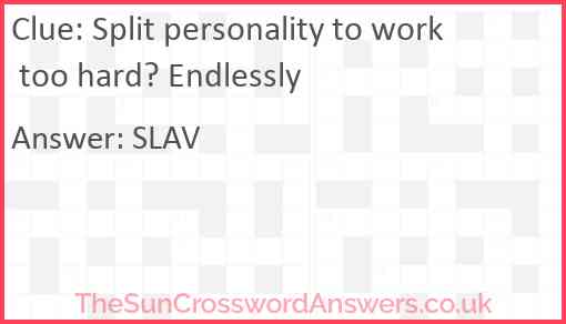 Split personality to work too hard? Endlessly is a crossword clue for which we have 1 possible answer and we have spotted 1 times in our database. This crossword clue was last seen on 05 August 2023 in The Sun Cryptic Crossword puzzle!