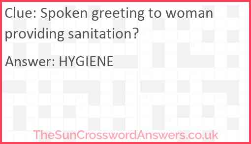 Spoken greeting to woman providing sanitation? is a crossword clue for which we have 1 possible answer and we have spotted 1 times in our database. This crossword clue was last seen on 10 September 2020 in The Sun Cryptic Crossword puzzle!