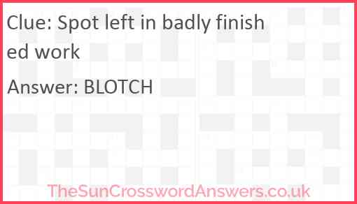 Spot left in badly finished work is a crossword clue for which we have 1 possible answer and we have spotted 2 times in our database. This crossword clue was last seen on 07 January 2025 in The Sun Cryptic Crossword puzzle!