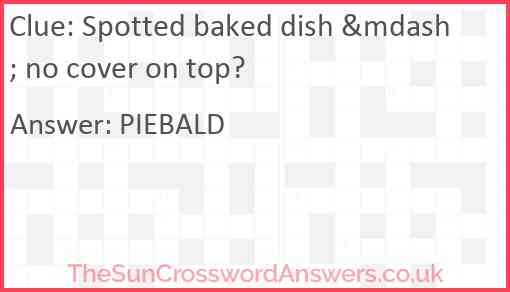 Spotted baked dish — no cover on top? is a crossword clue for which we have 1 possible answer and we have spotted 1 times in our database. This crossword clue was last seen on 03 February 2020 in The Sun Cryptic Crossword puzzle!