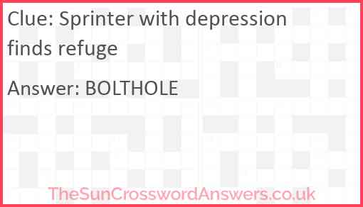 Sprinter with depression finds refuge is a crossword clue for which we have 1 possible answer and we have spotted 1 times in our database. This crossword clue was last seen on 16 March 2021 in The Sun Cryptic Crossword puzzle!