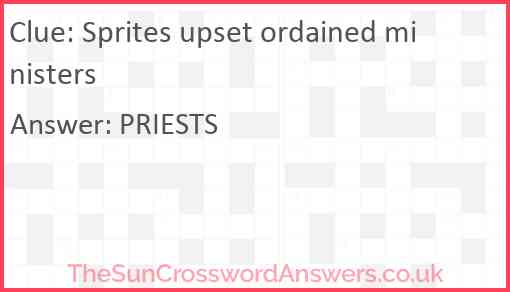 Sprites upset ordained ministers is a crossword clue for which we have 1 possible answer and we have spotted 1 times in our database. This crossword clue was last seen on 04 January 2024 in The Sun Cryptic Crossword puzzle!