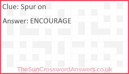Spur on is a crossword clue for which we have 2 possible answer and we have spotted 5 times in our database. This crossword clue was last seen on 12 March 2025 in The Sun Coffee Time Crossword puzzle!