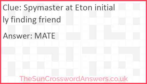 Spymaster at Eton initially finding friend is a crossword clue for which we have 1 possible answer and we have spotted 1 times in our database. This crossword clue was last seen on 02 November 2024 in The Sun Cryptic Crossword puzzle!