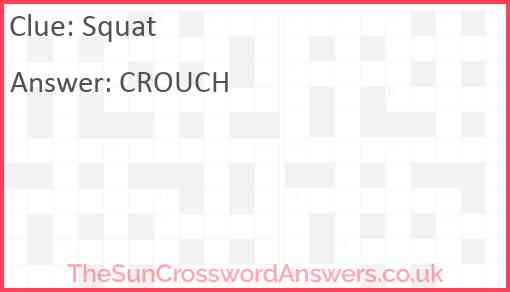 Squat is a crossword clue for which we have 1 possible answer and we have spotted 3 times in our database. This crossword clue was last seen on 02 May 2023 in The Sun Coffee Time Crossword puzzle!