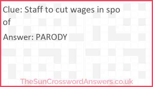 Staff to cut wages in spoof is a crossword clue for which we have 1 possible answer and we have spotted 2 times in our database. This crossword clue was last seen on 12 March 2023 in The Sun Cryptic Crossword puzzle!