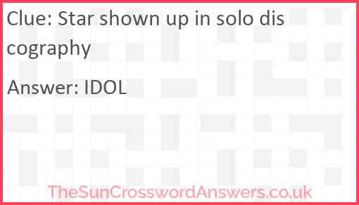 Star shown up in solo discography is a crossword clue for which we have 1 possible answer and we have spotted 2 times in our database. This crossword clue was last seen on 13 August 2021 in The Sun Cryptic Crossword puzzle!
