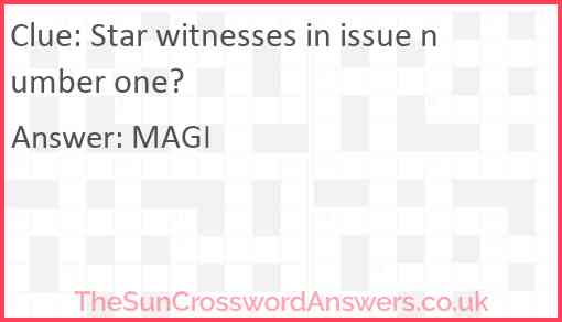 Star witnesses in issue number one? is a crossword clue for which we have 1 possible answer and we have spotted 1 times in our database. This crossword clue was last seen on 27 December 2019 in The Sun Cryptic Crossword puzzle!