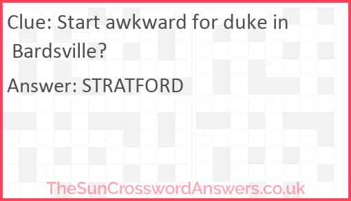 Start awkward for duke in Bardsville? is a crossword clue for which we have 1 possible answer and we have spotted 1 times in our database. This crossword clue was last seen on 29 November 2023 in The Sun Cryptic Crossword puzzle!