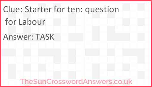 Starter for ten: question for Labour is a crossword clue for which we have 1 possible answer and we have spotted 4 times in our database. This crossword clue was last seen on 09 October 2024 in The Sun Cryptic Crossword puzzle!