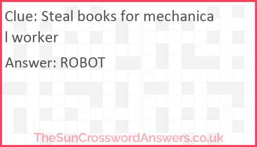 Steal books for mechanical worker is a crossword clue for which we have 1 possible answer and we have spotted 3 times in our database. This crossword clue was last seen on 27 January 2023 in The Sun Cryptic Crossword puzzle!