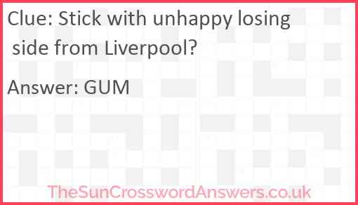 Stick with unhappy losing side from Liverpool? is a crossword clue for which we have 1 possible answer and we have spotted 1 times in our database. This crossword clue was last seen on 15 September 2023 in The Sun Cryptic Crossword puzzle!