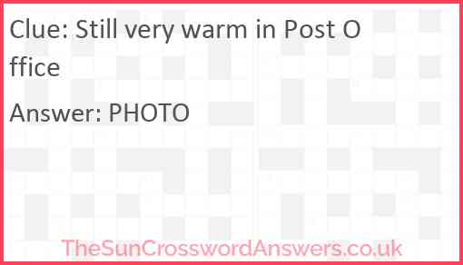 Still very warm in Post Office is a crossword clue for which we have 1 possible answer and we have spotted 2 times in our database. This crossword clue was last seen on 12 June 2022 in The Sun Cryptic Crossword puzzle!