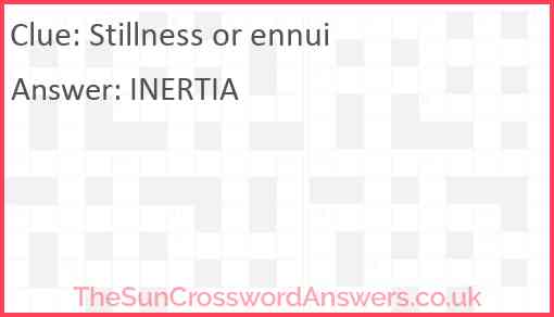 Stillness or ennui is a crossword clue for which we have 1 possible answer and we have spotted 2 times in our database. This crossword clue was last seen on 30 September 2020 in The Sun Coffee Time Crossword puzzle!