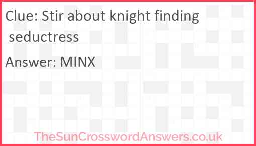 Stir about knight finding seductress is a crossword clue for which we have 1 possible answer and we have spotted 2 times in our database. This crossword clue was last seen on 20 February 2023 in The Sun Cryptic Crossword puzzle!